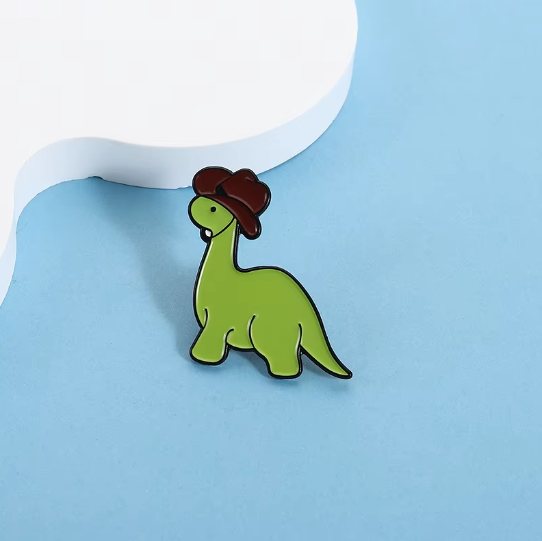 Verleihen Sie Ihrem Outfit eine humorvolle Note mit diesem charmanten Anstecker. Das Motiv zeigt einen niedlichen, grünen Langhals-Dinosaurier (Brontosaurus), der einen klassischen braunen Cowboyhut trägt – die perfekte Kombination aus Urzeit-Charme und Western-Flair.