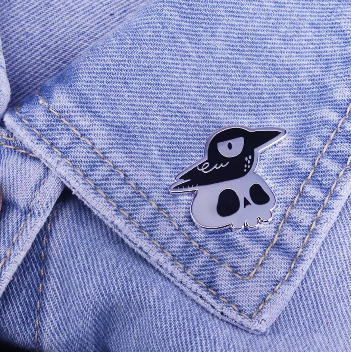 Produktinformationen "Anstecker Rabe auf Schädel – Schwarzer Rabe im Cartoon-Stil"