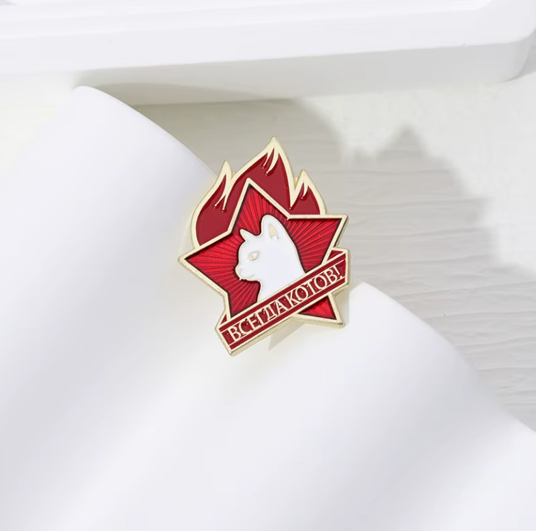 - Schriftzug: Goldfarbenes Banner mit der kyrillischen Aufschrift "ВСЕГДА КОТОВ!" (eine humorvolle Abwandlung von "Immer bereit!").
