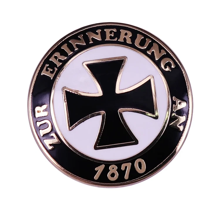 Ein stilvolles Accessoire für Geschichtsinteressierte und Sammler. Diese hochwertige Anstecknadel erinnert an das Jahr 1870 und den Deutsch-Französischen Krieg. Das Design vereint das klassische Eiserne Kreuz im Zentrum mit einem eleganten schwarz-weißem Finish und goldfarbenen Details. Durch die robuste Fertigung und die praktische Broschierung auf der Rückseite ist der Pin ideal für Revers, Hüte oder als Teil einer historischen Sammlung geeignet.