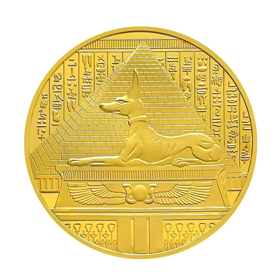Tauchen Sie ein in die Welt der Pharaonen! Diese detailreich geprägte Medaille ist dem Gott Anubis gewidmet, dem Wächter der Unterwelt. Die Vorderseite zeigt Anubis beim rituellen Wiegen des Herzens gegen die Feder der Maat – ein zentrales Symbol der ägyptischen Mythologie. Auf der Rückseite thront der Schakal-Gott schützend vor einer Pyramide, umgeben von klassischen Hieroglyphen.