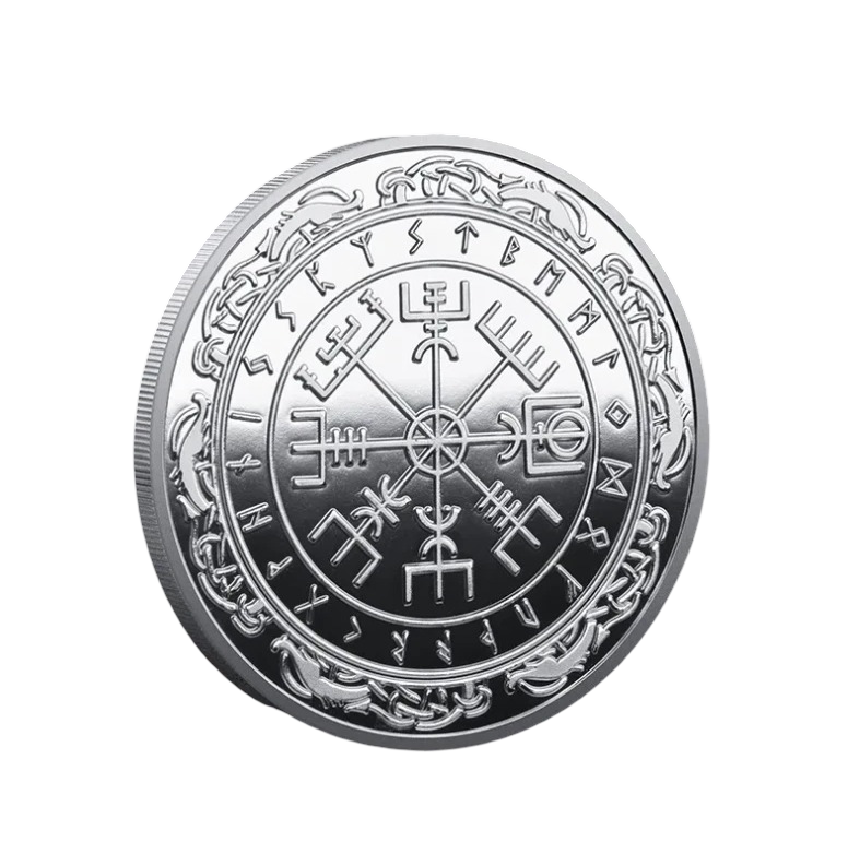 Verlieren Sie nie wieder Ihren Weg! Diese beeindruckende Gedenkmedaille ist dem Vegvísir gewidmet, einem der kraftvollsten Symbole der isländischen Tradition. Die Vorderseite zeigt den „Wegweiser“ im Zentrum eines Runen-Zirkels, umrahmt von kunstvollen keltischen Knotenmustern. Auf der Rückseite findet sich ein weiteres mystisches Runen-Stave-Symbol, ebenfalls eingebettet in das Futhark-Alphabet und die schützende Schlange Midgards.