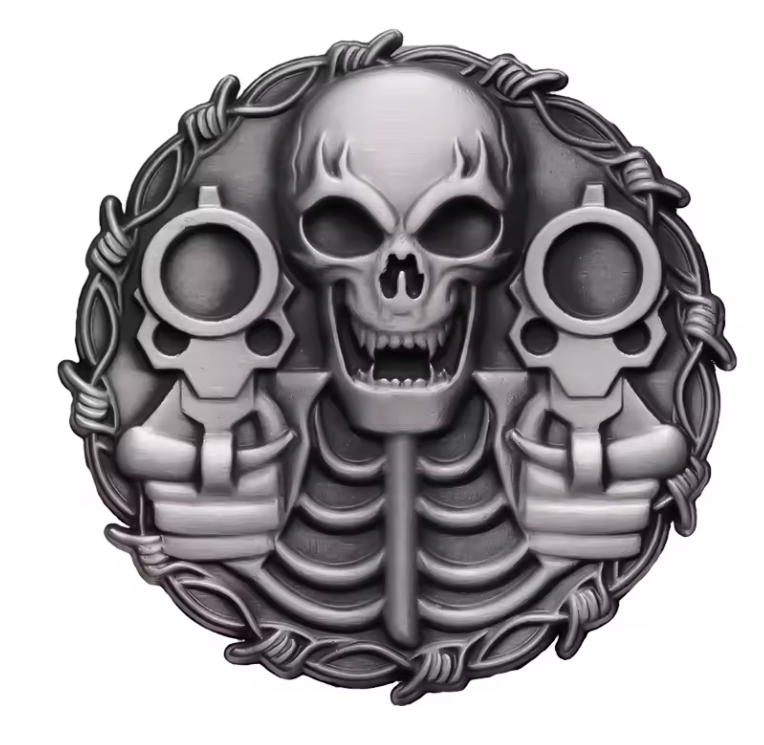 - Motiv: Totenkopf mit zwei Revolvern und Skelett-Elementen im Stacheldraht-Ring.