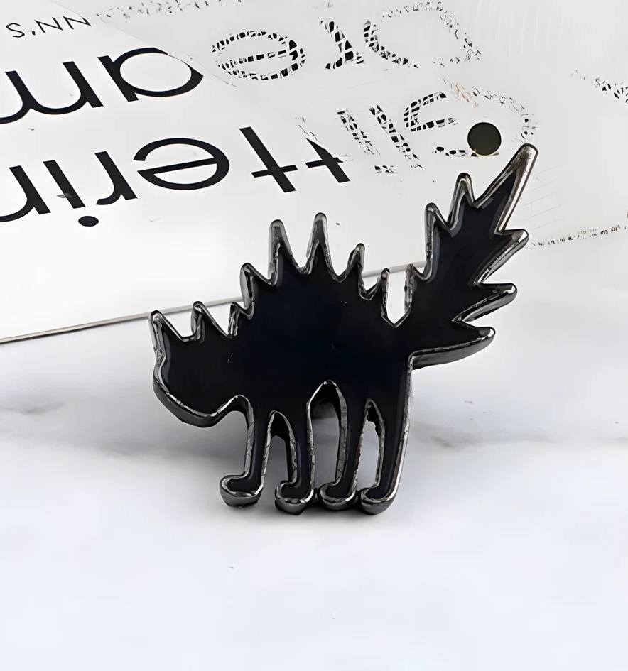 Dieser Anstecker zeigt eine schwarze Katze mit aufgestelltem Fell in einer typischen Schreckhaltung. Ein stylisches Accessoire für Katzenliebhaber, Gothics und Fans außergewöhnlicher Pins.