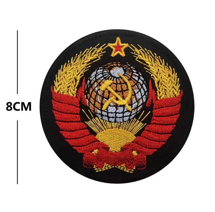 Dieser große, runde Aufnäher mit dem sowjetischen Staatswappen zeigt eine kunstvolle Darstellung von Hammer und Sichel auf einem Globus, umgeben von Ähren und einem roten Banner. Ein detailreicher Klassiker für Fans historischer Symbole, Cosplay oder kreative DIY-Projekte.
