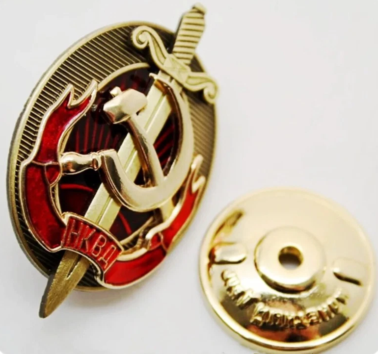 Ein kraftvolles Relikt der sowjetischen Geschichte für Ihre Sammlung. Dieses detailreiche Abzeichen zeigt die ikonische Symbolik der NKVD: Ein massives Schwert, das hinter einem ovalen Schild mit Hammer und Sichel geführt wird. Das markante rote Banner am unteren Rand trägt die kyrillischen Initialen „НКВД“. Mit seiner massiven Fertigung und dem authentischen Schraubverschluss ist dieser Pin ein Muss für Sammler von Militaria und geschichtlicher Symbolik der Sowjetunion.